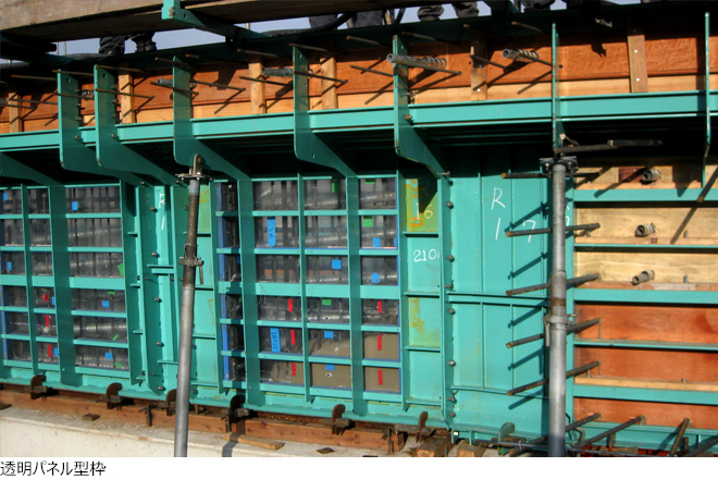 近年ではコンクリートの打設充填精度を上げる為、鋼製型枠桁製品面に透明パネルを設置し、打設充填状況が確認可能な仕様にも対応しております。